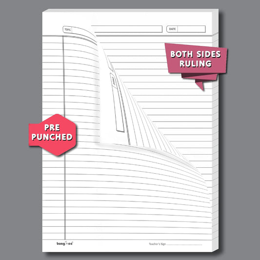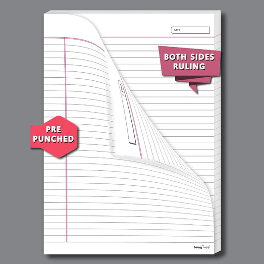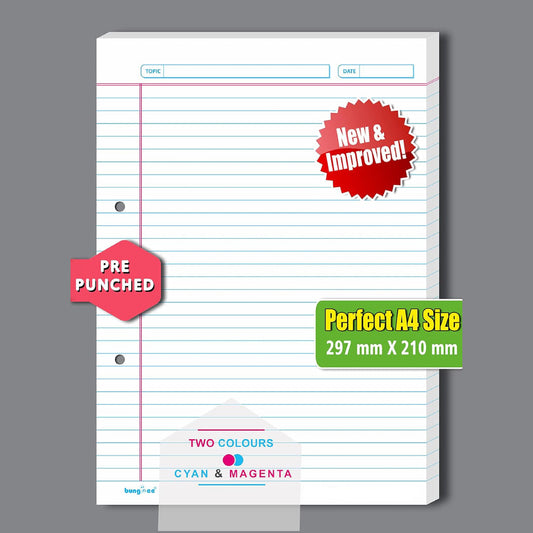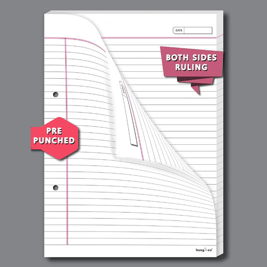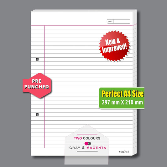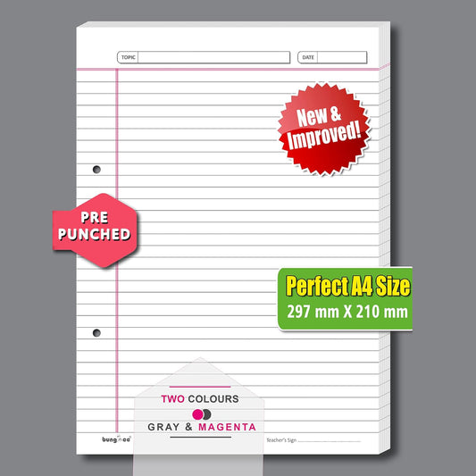 Bungbee A4 Size Ruled Sheets 90 GSM, White, Both Side Ruled, With Punch, With Margin | Grey colour Rule and Magenta Margin | Magna Edition | For Assignment, Project Work, Exam and For Office Use