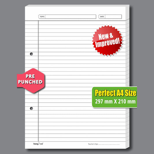 Bungbee A4 Size Ruled Sheets 90 GSM, White, Both Side Ruled, With Punch, With Margin | Grey colour Rule and Margin | Acer Edition | For Assignment, Project Work, Exam and for Office Use